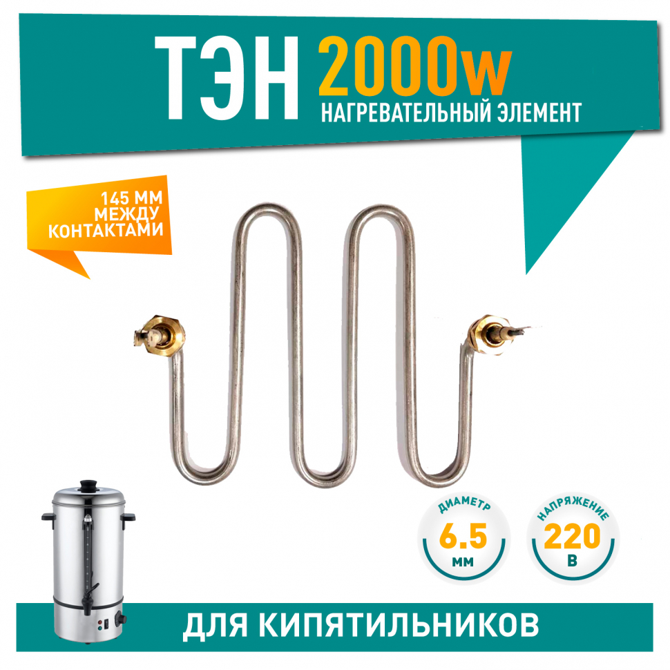 ТЭН (нагревательный элемент) мощностью 2000Вт обеспечивает быстрый и равномерный нагрев воды, поддерживая оптимальную температуру кипячения. Конструкция ТЭНа устойчива к высоким температурам, минимизируя риск выхода элемента из строя при регулярной работе. Расстояние между контактами 145мм. Рабочее напряжение 220В позволяет использовать его в бытовых условиях.