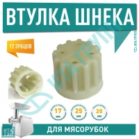 Универсальная втулка шнека на 12 зубцов подходит для разных брендов и применима к большинству устройств. Такие комплектующие, как правило, выходят дешевле и служат не хуже оригинальных. Диаметр самой втулки — 25 мм, внутреннего отверстия — 17 мм, с четырьмя упорами внутри