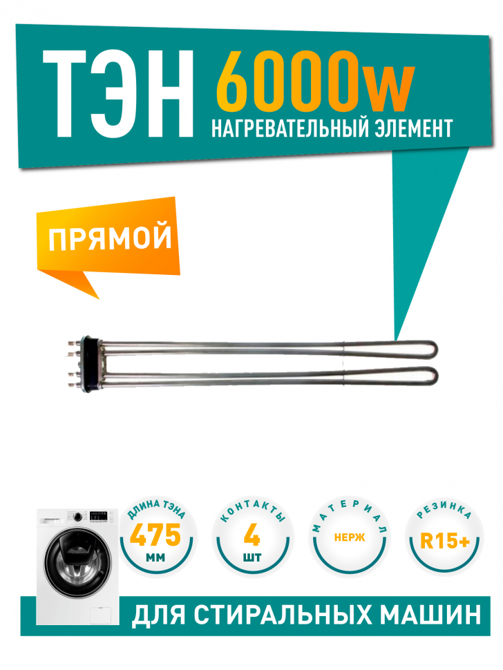 ТЭН имеет прямую форму и рабочую длину 465 мм, что делает его удобным для установки в большинство моделей профессионального стирального оборудования. Ширина резинки с буртиком составляет 15 мм, гарантируя плотное и безопасное соединение с корпусом стиральной машины.